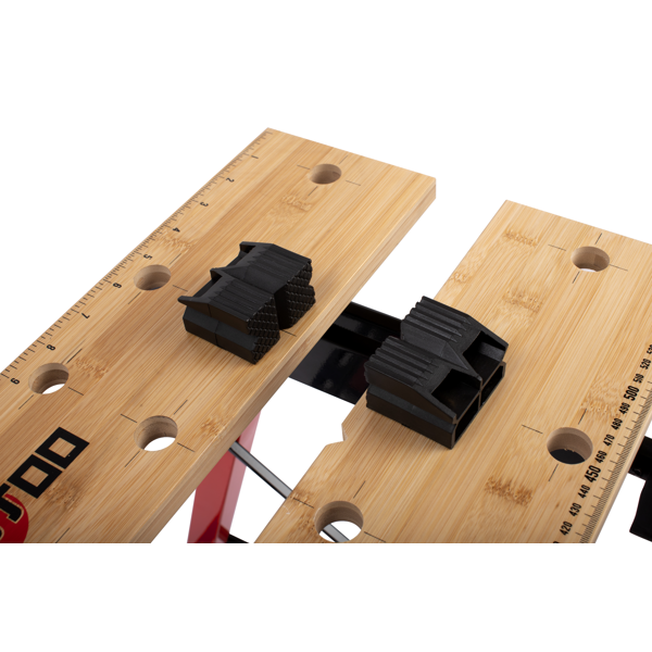 Верстак предназначен для зажима и крепления плоских деталей различной формы, а также заготовок цилиндрической формы для последующего распила, обработки поверхностей и торцов, а также сверления отверстий. Устойчивая станина с системой быстрого складывания для компактного хранения. Максимальная нагрузка – 100 кг. Рабочая поверхность панелей с высококонтрастной юстировочной шкалой, транспортиром и линейкой для удобства разметки заготовок. Удобная высота рабочего стола для комфортной работы с заготовками. Панели с упрочненной поверхностью произведены из бамбука. Станина с резиновыми противоскользящими опорами. Система пластиковых упоров специально разработанной формы позволяет надежно зажимать плоские детали шириной до 235 мм, плоские заготовки круглой формы диаметром до 380 мм, а также заготовки цилиндрической формы диаметром до 33,5 мм. 2 интегрированных отделения для хранения инструментов. Инструкция по сборке, эксплуатации и хранению изделия – внутри коробки.